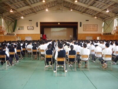 勉学や進路活動に勤しんだ人、部活動に注力した人、余暇を楽しんだ人のほか、長期休業を利用したアルバイトで働くことの意義を学んだ人もいると思います。全校集会では、夏季休暇中等に活躍したバドミトン部、山岳部、陸上競技部の賞状伝達が行われました。