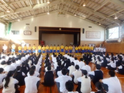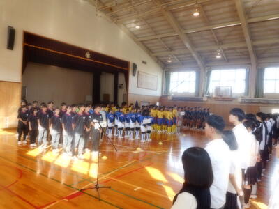 全道大会に進出したサッカー部、ラグビーフットボール部、ソフトボール部、美術部、陸上競技部の壮行会を開催し、併せて最近の大会で優秀な成績を収めた部活動の賞状伝達も行いました。